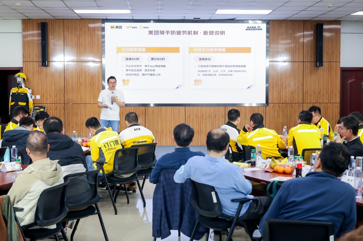 结合与会骑手的热烈反馈,美团骑手保障组相关负责人介绍,平台正计划在保持已有机制基础上进行两点优化:一是在疲劳提醒弹窗中新增休息按钮,骑手可一键点击休息,休息期间也可随时恢复接单;二是分别在骑手连续跑单7天、26天和52天时推送疲劳提醒,并将情况同步站点,与骑手协商调整跑单节奏。“无论是单日还是连续多日的‘防疲劳’机制,都要为骑手的健康和风险着想,同时充分尊重骑手意愿。”