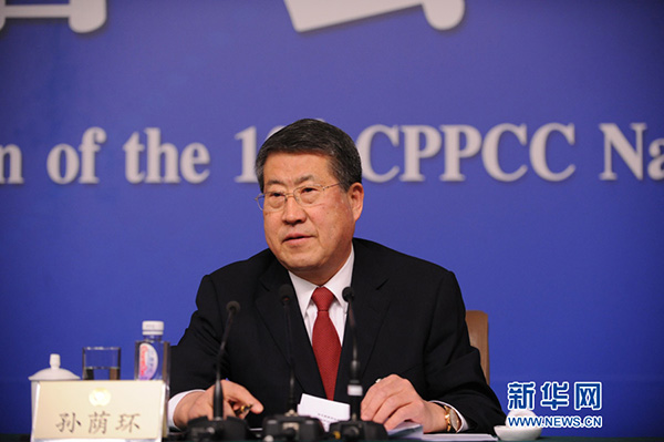 3月11日14时30分,全国政协十二届四次会议在梅地亚中心多功能厅举行记者会,邀请5位企业家委员就提振经济发展信心,企业在调整结构、转型升级、提质增效中发挥积极作用回答记者提问。图为全国政协常委、全国工商联副主席、亿达集团董事局主席、大连软件园股份有限公司董事长孙荫环。新华网/中国政府网 陈杰 摄