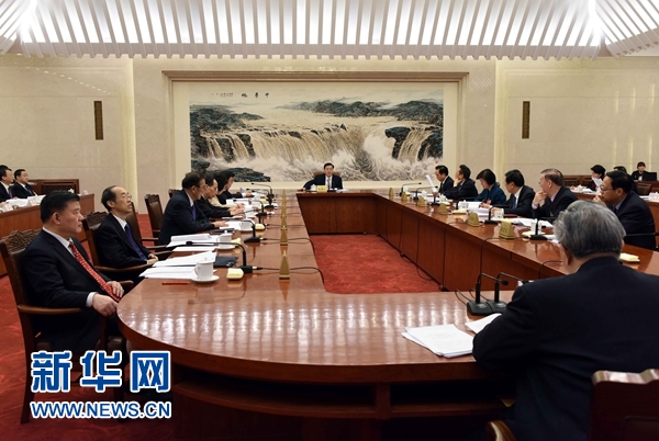 3月12日,十二届全国人大四次会议主席团常务主席第一次会议在北京人民大会堂举行。十二届全国人大四次会议主席团常务主席、全国人大常委会委员长张德江主持会议。新华社记者 饶爱民 摄