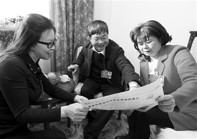 湖南代表团全国人大代表雷冬竹、胡建文、杨莉(从左至右)当日在驻地一起讨论报纸上的两会新闻。 新华社记者 陈建力 摄