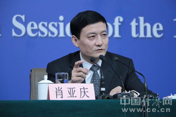 十二届全国人大四次会议新闻中心于3月12日(星期六)14时30分在梅地亚中心多功能厅举行记者会,邀请国务院国有资产监督管理委员会主任肖亚庆、副主任张喜武、副主任黄丹华和副秘书长、新闻发言人彭华岗就“国企改革”的相关问题回答中外记者的提问。图为国资委主任肖亚庆。中国经济网记者 韩璐 摄