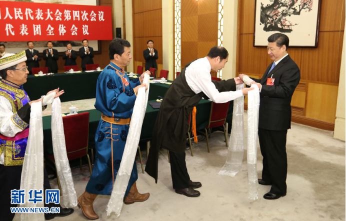 3月10日,习近平参加十二届全国人大四次会议青海代表团的审议。这是少数民族代表向习近平敬献哈达。新华社记者 黄敬文摄