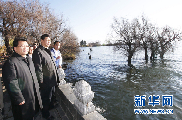 2015年1月20日,习近平来到大理白族自治州大理市湾桥镇古生村,仔细察看洱海边的生态保护湿地。 新华社记者 鞠鹏 摄