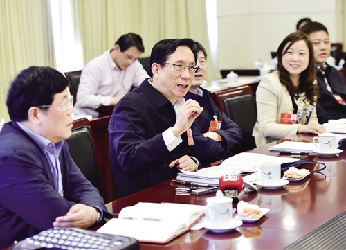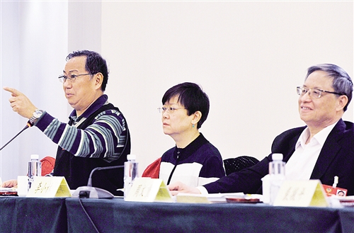 3月11日,人大上海代表团分组审议报告。全国人大代表李玉赋(前排左二)就做好自贸区改革发展工作发表自己的看法。 本报记者 李景录摄