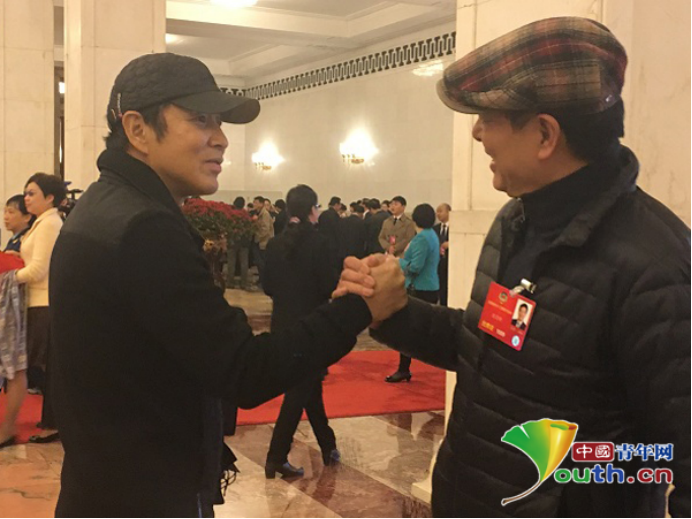陈道明与濮存昕在人民大会堂一楼大厅不期而遇,俩人“掰腕”打招呼。 记者 任润波 摄