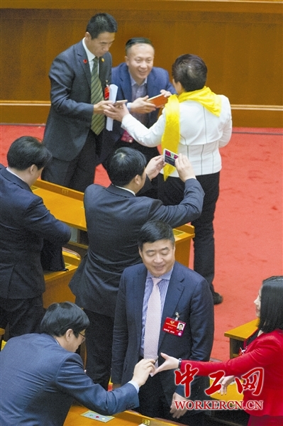 3月14日下午,全国政协十二届四次会议在北京人民大会堂闭幕后,委员们在会场内握手道别、合影留念。中工网记者 吴凡 摄
