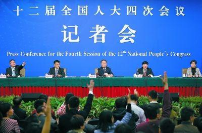 昨天,十二届全国人大四次会议新闻中心举行记者会,交通部部长杨传堂、交通部运输服务司司长刘小明、北京交通发展研究中心主任郭继孚就“深化出租汽车改革与发展”的相关问题回答中外记者的提问。本报记者 饶强摄