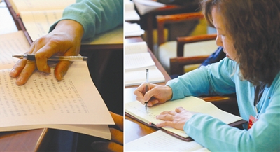 全国政协委员韩爱萍在小组讨论中读文件,做记录。