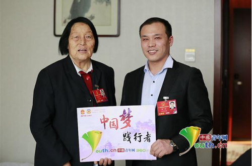 采访中途,山西团的一名80后全国人大代表董林来看望申纪兰,遇到记者采访,申纪兰指着董林说:“中国梦需要他们来践行,他是青年代表。” (记者李延兵 郭蕾)