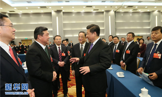 3月4日下午,中共中央总书记、国家主席、中央军委主席习近平看望参加全国政协十二届四次会议的民建、工商联委员,并参加联组会,听取委员们意见和建议。中共中央政治局常委、全国政协主席俞正声参加看望和讨论。新华社记者兰红光 摄