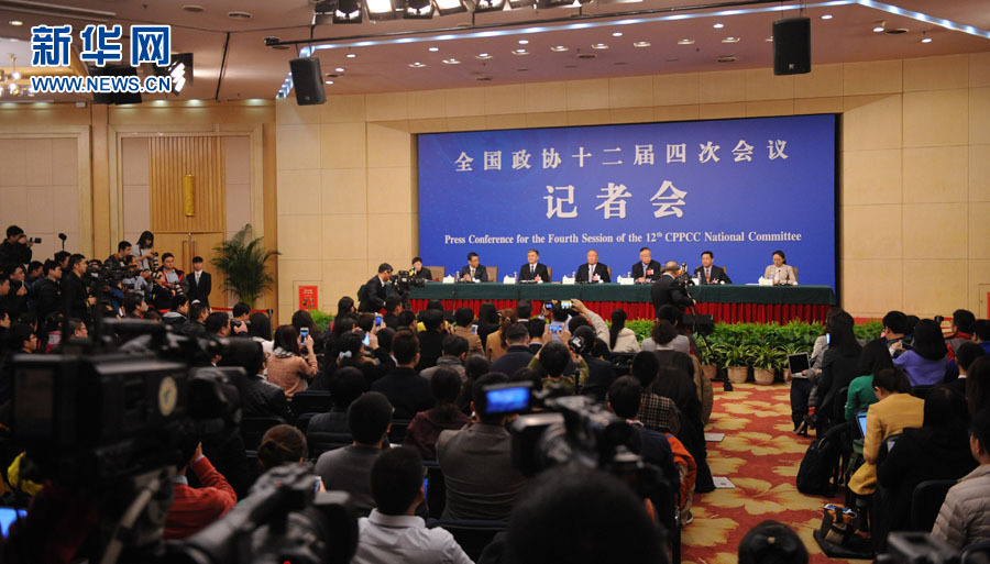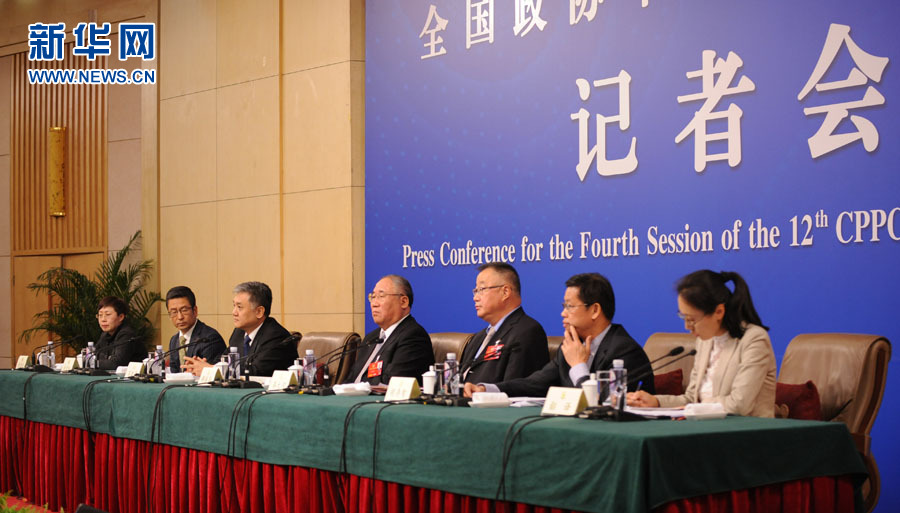 3月7日(星期一)15时,全国政协十二届四次会议在梅地亚中心多功能厅举行记者会,邀请5位全国政协委员就全面节约和高效利用资源,推动低碳循环发展,加大环境整治力度特别是大气、水和土壤污染防治,加强生态保护和修复,有序有度利用自然,促进生态环境质量总体改善等回答记者提问。图为5位委员回答记者提问。新华网/中国政府网记者 陈杰 摄