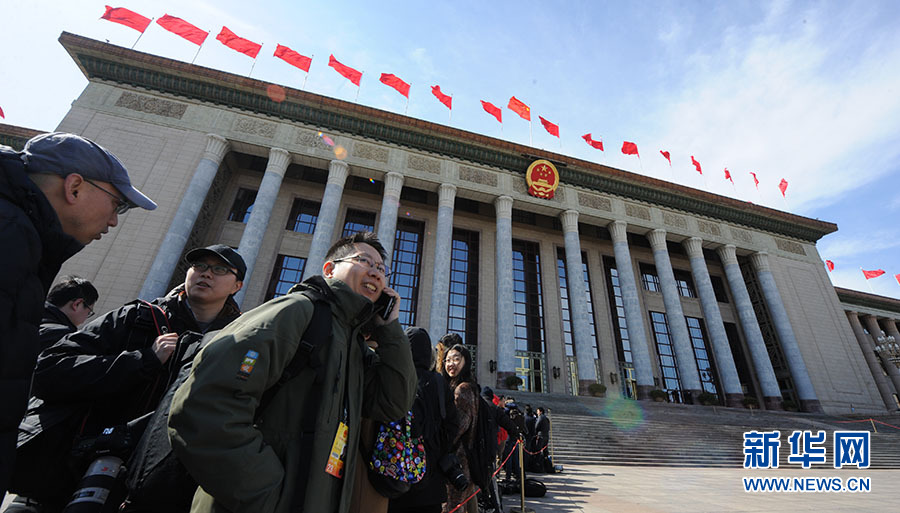 3月9日下午3时,第十二届全国人民代表大会第四次会议在人民大会堂举行第二次全体会议,听取全国人大常委会委员长张德江关于全国人民代表大会常务委员会工作的报告,听取全国人大常委会副委员长李建国关于中华人民共和国慈善法草案的说明。图为在人民大会堂东广场排队等待入场的记者们。新华网/中国政府网 陈竞超 摄