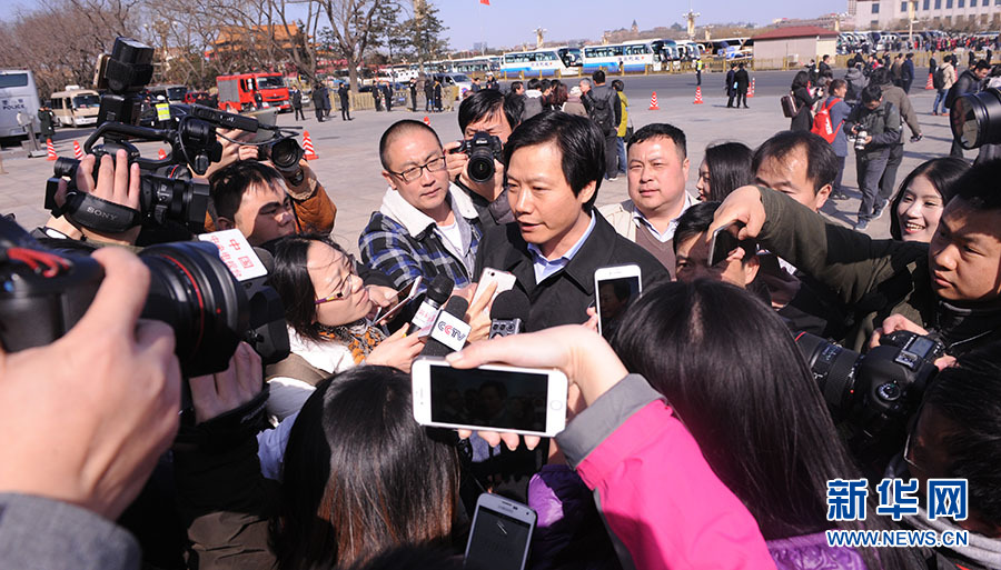 3月9日下午3时,第十二届全国人民代表大会第四次会议在人民大会堂举行第二次全体会议,听取全国人大常委会委员长张德江关于全国人民代表大会常务委员会工作的报告,听取全国人大常委会副委员长李建国关于中华人民共和国慈善法草案的说明。图为代表雷军接受记者采访。新华网/中国政府网 陈杰 摄