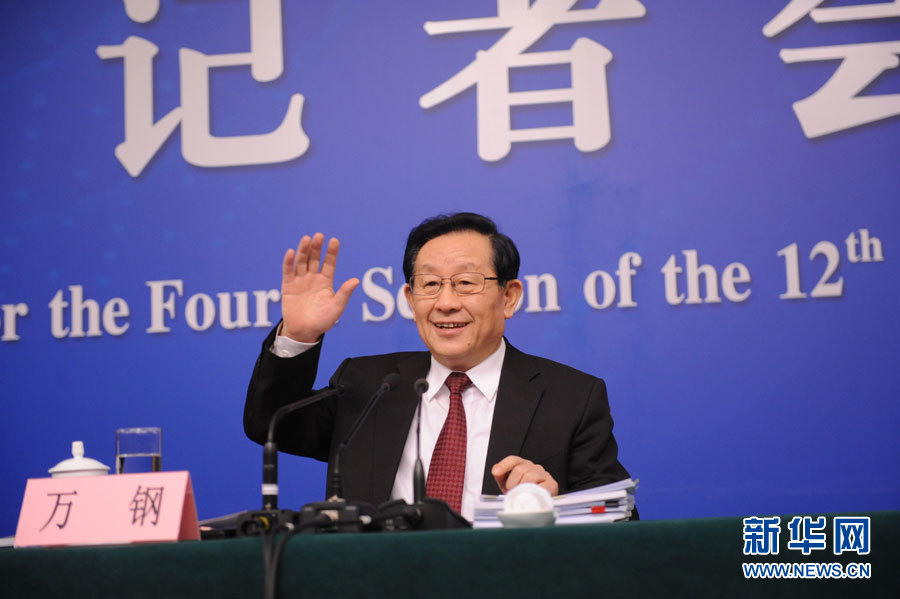 十二届全国人大四次会议新闻中心于3月10日(星期四)10时45分在梅地亚中心多功能厅举行记者会,邀请科技部部长万钢、中国科技大学常务副校长潘建伟、浙江省科技厅厅长周国辉就“科技创新发展”的相关问题回答中外记者的提问。图为科技部部长万钢和媒体记者打招呼。新华网/中国政府网记者 陈杰 摄