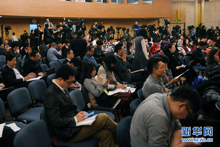 3月11日,十二届全国人大四次会议新闻中心举行记者会,邀请环境保护部部长陈吉宁就“加强生态环境保护”的相关问题回答中外记者的提问。图为记者会即将开始。新华网/中国政府网 陈杰 摄