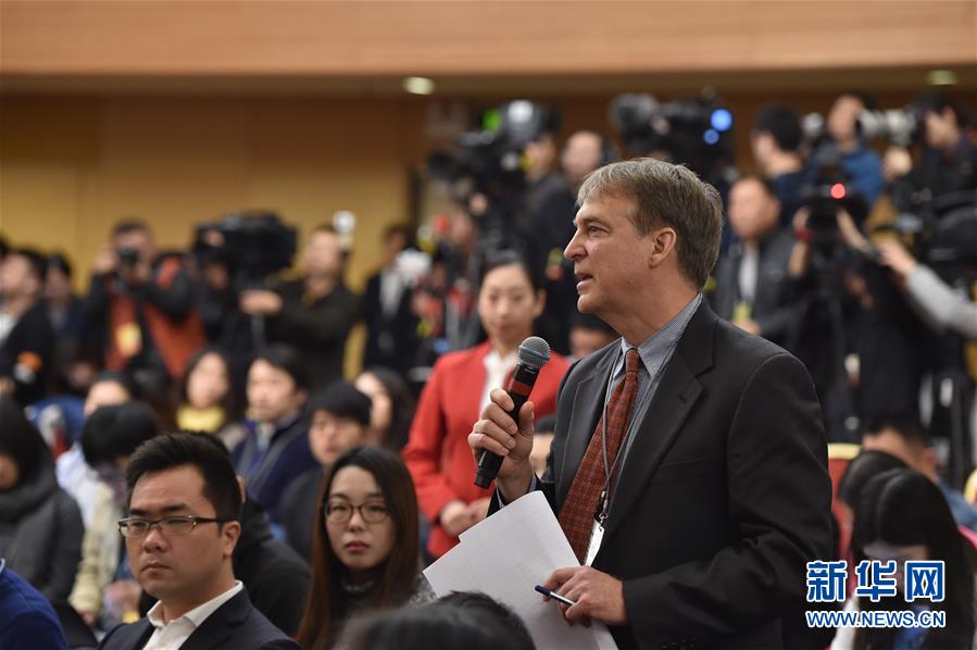 3月11日,十二届全国人大四次会议新闻中心举行记者会,邀请环境保护部部长陈吉宁就“加强生态环境保护”的相关问题回答中外记者的提问。这是一名外国记者在提问。新华社记者 李鑫 摄