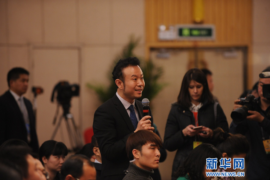 3月11日14时30分,全国政协十二届四次会议在梅地亚中心多功能厅举行记者会,邀请5位企业家委员就提振经济发展信心,企业在调整结构、转型升级、提质增效中发挥积极作用回答记者提问。 图为中央电视台记者提问。新华网/中国政府网 陈杰 摄