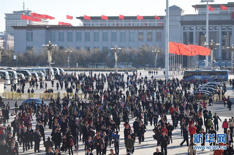 3月13日,十二届全国人大四次会议在北京人民大会堂举行第三次全体会议。这是全国人大代表抵达天安门广场。 新华社记者陈晔华摄