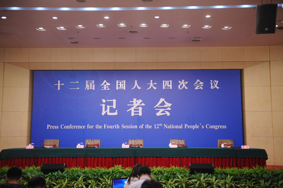十二届全国人大四次会议新闻中心于3月14日(星期一)10时在梅地亚中心多功能厅举行记者会,邀请交通运输部部长杨传堂、交通运输部运输服务司司长刘小明、北京交通发展研究中心主任郭继孚就“深化出租汽车改革与发展”的相关问题回答中外记者的提问。图为记者会现场,记者会即将开始。新华网/中国政府网 陈杰 摄