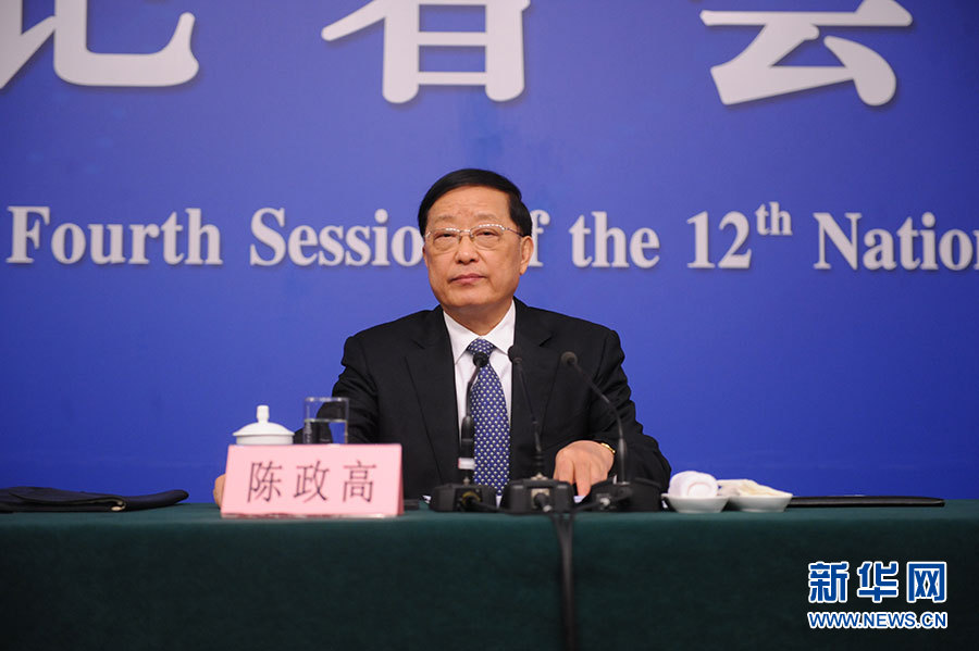 十二届全国人大四次会议新闻中心于3月15日(星期二)10时在梅地亚中心多功能厅举行记者会,邀请住房和城乡建设部部长陈政高、副部长陆克华、副部长倪虹就“棚户区改造和房地产工作”的相关问题回答中外记者的提问。图为陈政高回答记者提问。新华网/中国政府网 陈杰 摄