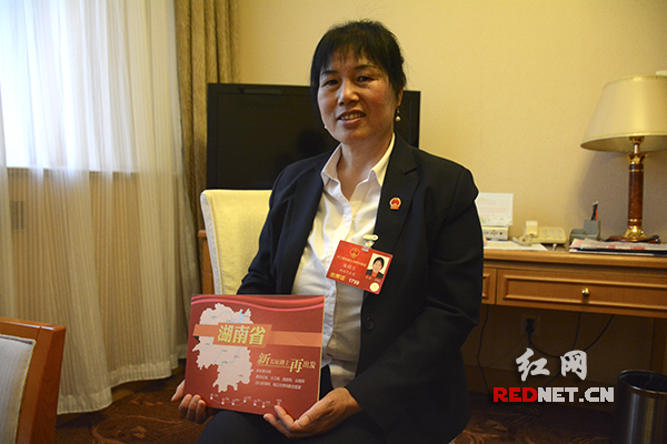 全国人大代表、宁乡县花明楼镇花明楼社区党支部书记潘润兰在湖南团代表驻地接受记者专访。