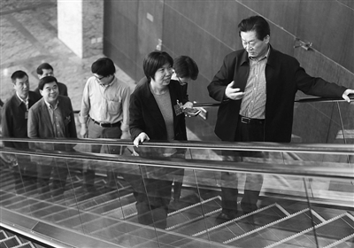 3月14日,在四川代表团小组会议前,代表们在乘坐电梯时不忘讨论。两天来,来自各行各业的代表,结合自己的调研经历和工作实际,围绕牵动民心的热点难点话题提出各自的意见和建议。本报记者 杨登峰 摄
