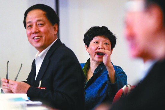 3月8日,全国政协十二届四次会议小组讨论,全国政协常委、九三学社中央副主席印红(右)发表观点。她表示,应对长江流域水环境污染实行系统治理和综合治理,立足山水林田湖生命共同体,统筹自然生态各要素,把沿江与沿山、沿林、沿田有机结合起来,从涵养水源、修复生态入手,统筹上下游、左右岸、地表地下、城市乡村、工程措施和非工程措施,协调解决水生态和环境保护问题。中国青年报·中青在线记者赵迪/摄
