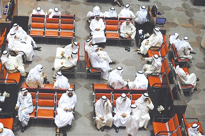 ▲10月7日,在科威特股票交易所,股民在关注股票行情。受全球金融危机影响,中东地区各国股市当日纷纷下跌。当天跌幅最大的是埃及股市,其股指下跌了16.4%,这是两年里埃及股市最大一次跌幅。