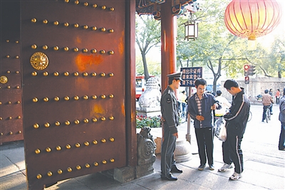 10月8日,北京大学保卫人员检查出入证件。继奥运期间的“限客令”及目前实行的“验证放行”办法后,北大保卫部门正酝酿明年推出“刷卡”入校审核制。