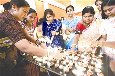 近日,信奉印度教的妇女迎来了为期10天的杜尔迦女神节。图为10月8日在印度人口最多、规模最大的城市加尔各答,妇女们一大早就来到神庙点燃陶灯,顶礼膜拜,祈求自己和家人平安。肖劼 供图