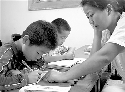 10月5日在安徽宿州一家寄宿制儿童学校,两个孩子眯着眼、低着头无精打采地作着作业,而他们的家长带着深深地无奈托着下巴给孩子辅导。黄金周里应让孩子们放开手脚尽情玩耍,给他们一片属于自己的天空。安徽省 丁晓素