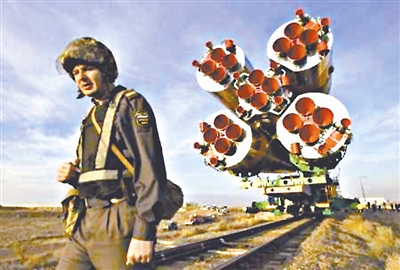 本月12日,俄“联盟TMA-13”载人飞船将载着第18长期考察组前往国际空间站。考察组成员包括美俄宇航员和第六位太空游客、美国电脑游戏商加里奥特。图为10月10日在哈萨克斯坦拜科努尔航天基地,飞船正被运往发射塔。肖劼 供图