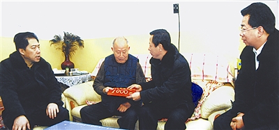 中国铝业贵州分公司总经理常顺清(右二)、贵州铝厂厂长周利洪(左一)、贵州铝厂工会主席陈刚(右一)慰问离退休老同志。