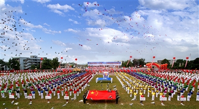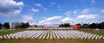 2008年8月15日,贵铝职工在厂庆50周年暨第二届职工文化体育艺术节开幕式上进行千人太极拳表演。