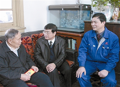 董事长、党委书记吴方辉(中)和副书记、工会主席车德云(右一)慰问老劳模