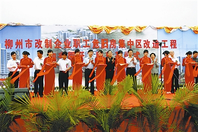 柳州市四大班子领导与市总工会领导为柳州市首个改制企业危旧房集中区改造工程——和兴园开工暨奠基剪彩。