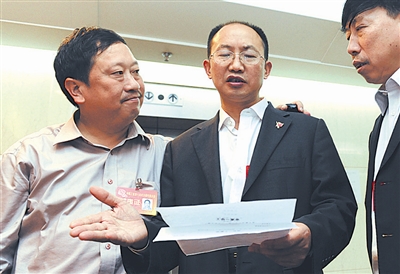 四川汶川地震英雄、青川县总工会主席田行卫(右二)成为参加十五大的特邀代表,在驻地,当看到在灾区最困难的时候给予他们及时而慷慨帮助的工会同行时,难掩激动之情,在表达感谢的同时,更表示一定要建设好家园,回报社会。本报记者 许之丰 摄
