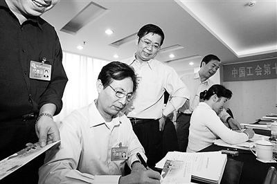 10月18日上午11时半,工会十五大海南团上午讨论会结束后,来自中海油化学股份有限公司的工会主席洪俊炼(左三)拿起为工会十五大制作的首日封,请各位代表签名,他希望各位代表回去后加强联系,交流各自的经验,推动工会事业的发展。 本报记者 杨登峰 摄