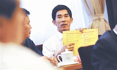 旷天良向代表们展示有王兆国同志和孙春兰同志签名的节目单。本报记者 许之丰 摄