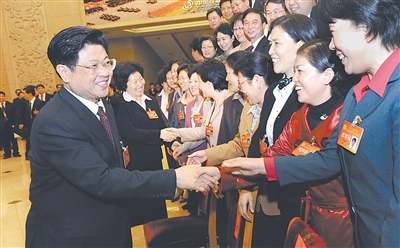 中共中央政治局委员、全国人大常委会副委员长、中华全国总工会主席王兆国10月20日晚亲切会见新当选的中华全国总工会第十五届执委会委员。本报记者 许之丰 摄