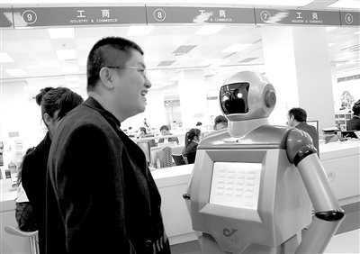 10月20日,一种智能迎宾机器人在沈阳市行政审批服务中心“上岗”。这种机器人集自主行走、自动避障、遥控操作、语音交互等功能于一身,身高1.6米,宽0.7米,重达50公斤。新华社记者 姜敏 摄