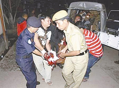 10月21日晚间,印度东北部曼尼普尔邦首府英帕尔市一警察局附近发生炸弹爆炸,造成至少17人丧生,30多人受伤。图为救援人员正抬着一名伤员将其送往医院。吉平 供图