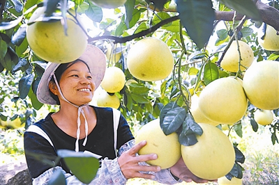 以花果著称的闽南侨乡福建省漳州市今年蜜柚又获丰收。近年来,当地农民大力发展蜜柚、香蕉、荔枝等特色农业,全市仅蜜柚种植面积就达60多万亩,年产量70多万吨,产品畅销全国各大城市并远销东盟国家,蜜柚生产已成为当地农民增收的重要途径。新华社记者 张国俊 摄