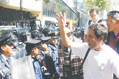 10月23日,反对能源改革的示威者在墨西哥首都墨西哥城的参议院外与联邦警察对峙。当日,墨西哥参议院以109票支持、10票反对的投票结果,通过了墨西哥能源改革法案中针对墨西哥国家石油公司体制改革的第7部分。反对能源改革的示威队伍聚集在参议院外,并同警察发生了冲突。新华社发 (阿图罗 摄)
