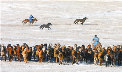 牧人在内蒙古西乌珠穆沁旗境内雪原上牧马(2008年2月摄)。