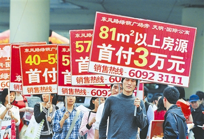 图为10月19日,郑州一房展会上,某房地产开发商新建的商品房住宅楼房打出了“81平方米以上房源,首付3万元”的广告以吸引购房者的目光。 沙浪 摄