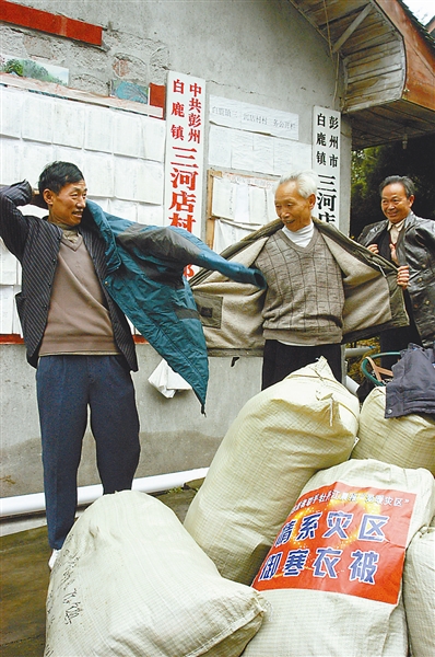 10月27日,三河店村村民试穿捐赠的御寒衣服。当日,四川省重灾区彭州市白鹿镇三河店村村民,收到黑龙江省牡丹江市热心市民捐赠来的御寒衣被。