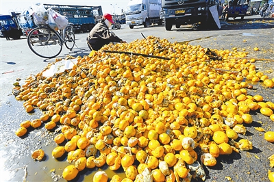 10月27日,北京新发地橘子批发市场,门庭冷落。这个占该市约50%橘子销售市场的冷寂,源于一条内容为“四川广元的橘子有虫”的短信,尽管一周来官方强力辟谣,市场仍未见回暖。一些箱装橘子已降到5元一箱,很多橘商已开始离场。这个市场中的商户说,每车的损失保守估计都在1.5万元左右,而整个市场每天都将损失300万元。江心 摄