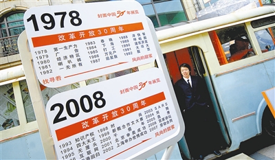 10月27日,上海新天地附近,一辆当年在上海公交线上服役的老式巨龙电车上正在举行一个“封面中国30年展览”。除了在30件印有不同年份的T恤上展示了不同年代的杂志封面外,星火牌9吋黑白电视机等一些在当年凭票购买、十分紧俏的家庭生活品也展现在观众的面前,成为改革开放30年来人民生活变化的一个时代缩影。杨毅 摄