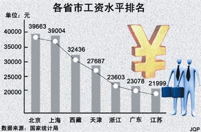 今年三季度末,全国城镇单位在岗职工平均工资排在前六位的是,北京(39663元)、上海(39004元)、西藏(32436元)、天津(27687元)、浙江(23603元)、广东(23078元)。而平均工资最低的是新疆,为全国平均工资的79.5%。
